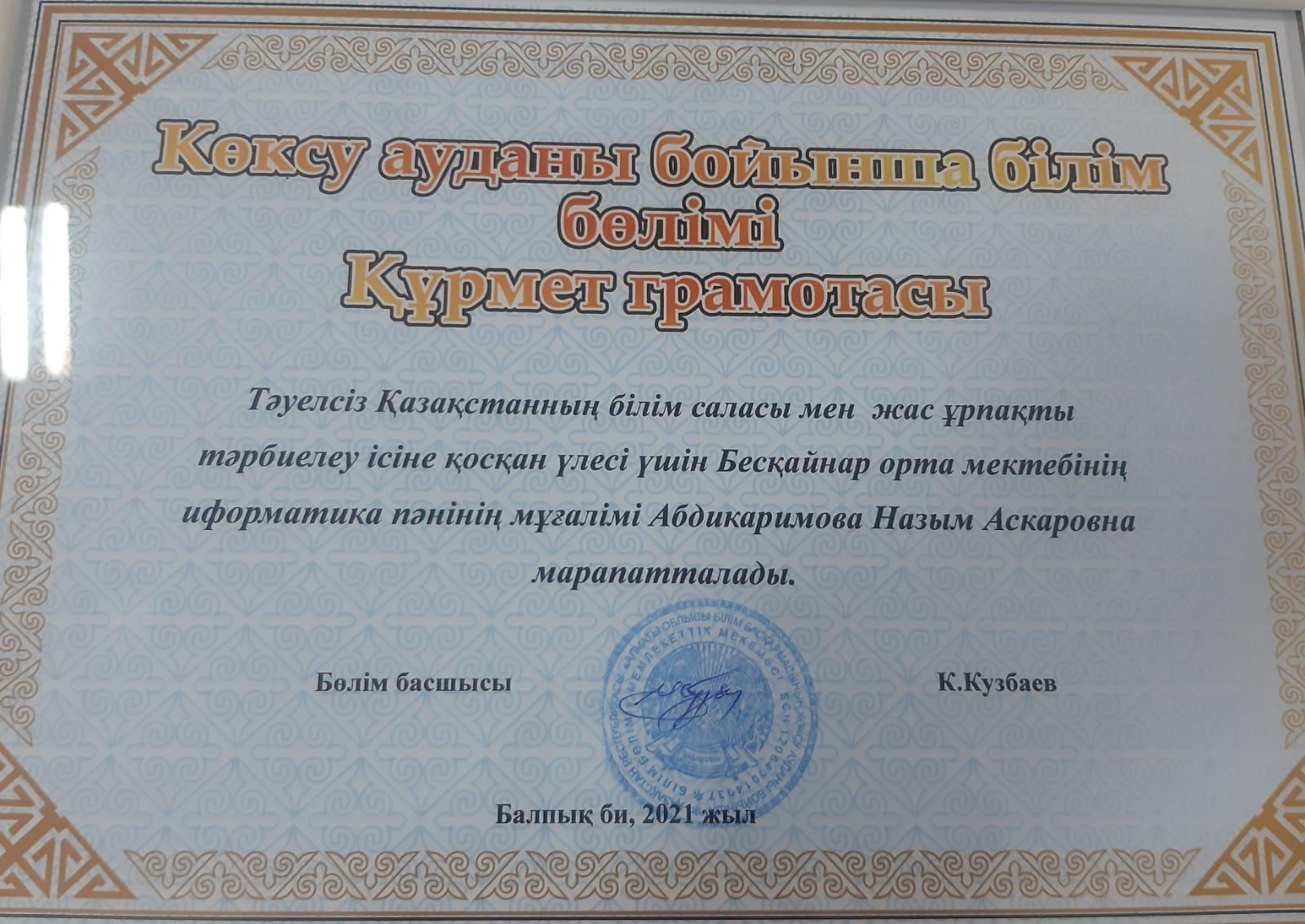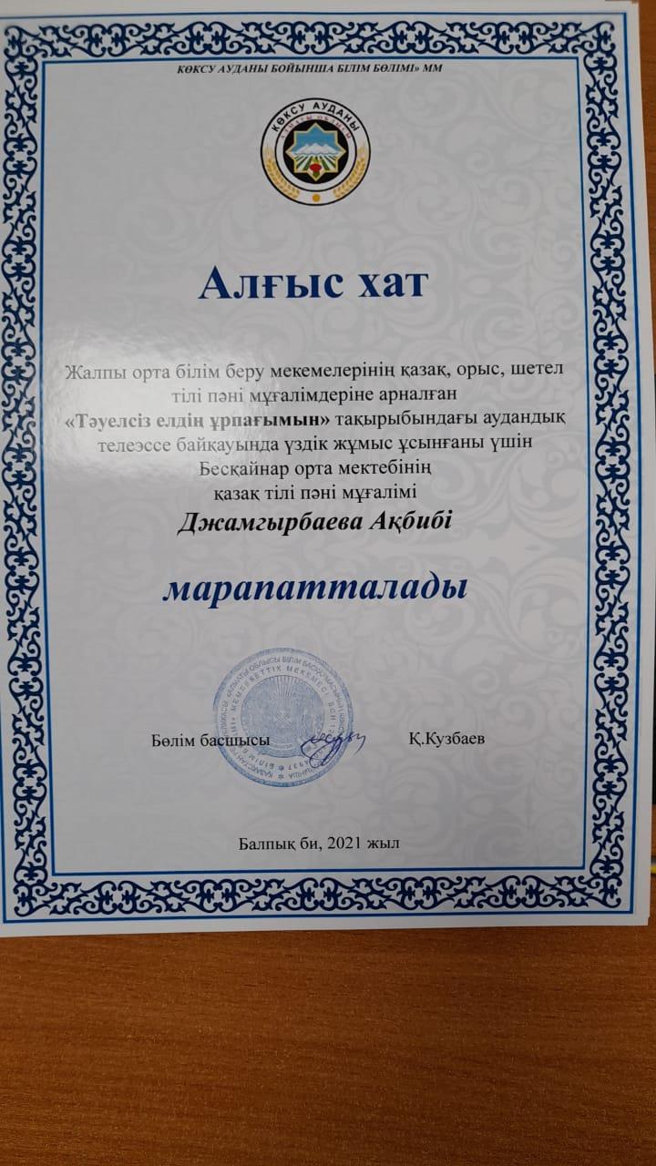 Тәуелсіздіктің 30 жылдығына орай марапатталған оқушылар мен мұғалімдер » Жетісу облысы Көксу ауданы Бесқайнар орта мектебі