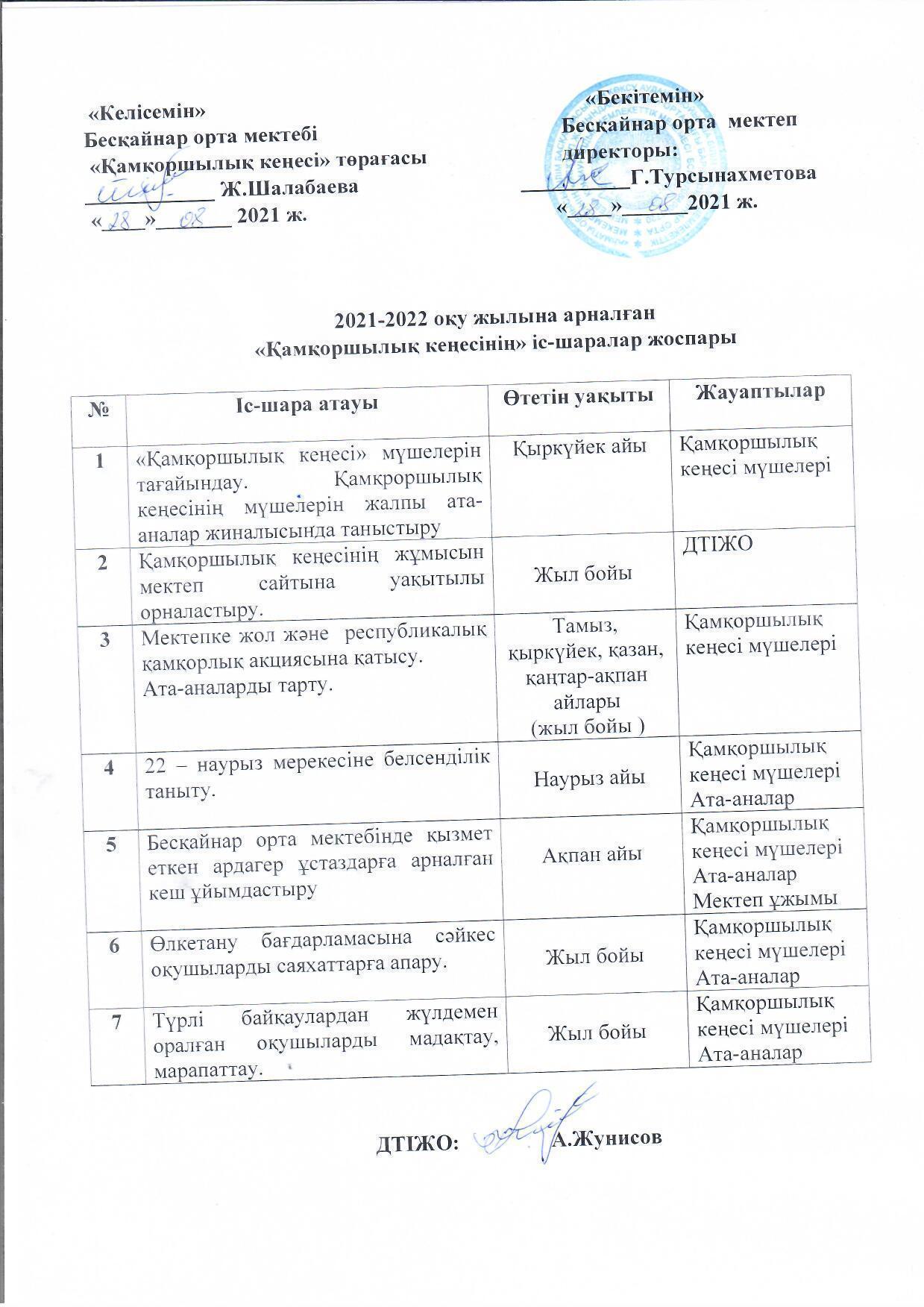 "Қамқоршылық кеңесінің" іс-шаралар жоспары » Жетісу облысы Көксу ауданы Бесқайнар орта мектебі